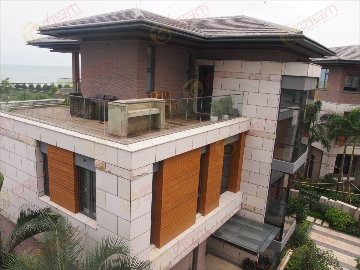 這個(gè)是百妥木合作的保利陽江外墻板別墅外墻項(xiàng)目,整個(gè)別墅的風(fēng)格 在鋼筋水泥玻璃的基礎(chǔ)上,點(diǎn)綴性的裝飾著木質(zhì)感的共擠木外墻板,顏色和材質(zhì)上的跳躍給別墅帶來了靈動(dòng)和活力。
