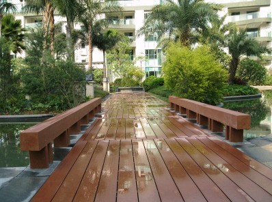 東莞市碧桂園小區綠化工程已經竣工,在此次項目中,百妥木公司為其提供了小區木地板材料,在小區水池上鋪設了一條供人過橋的塑木棧道,非常實用的同時也增加了小區本身的美觀性。